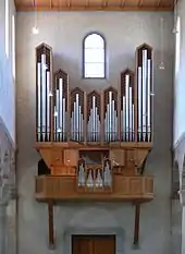 The first pipe organ from the 15th century AD was a swallow's nest organ hung on the northern high wall of the nave. In 1529 it was canceled in the wake of the Reformation as an unpleasant pope lyra and decoy for anti-Christian Roman worship. In 1597 the city council considers that the organ should be reintroduced, the clergy reacted strongly and secured a sustainable waiver of such attempts. So it was not until the year 1879, to when Johann Nepomuk Kuhn was finally allowed to install a new organ on the westerly gallery. It was a mechanical cone chest organ. The magnificent neogothic housing was built according to the plans of the then known architects and builders Franz Müller und August In 1929 a rather wide drastic remodeling by the builders Kuhn was done.[2]