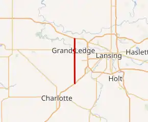 M-100 is a north–south state trunkline highway in the central region of the U.S. state of Michigan. It runs between Potterville and Grand Ledge, connecting Interstate 69 (I-69) and I-96 west of the state capital, Lansing. The highway was previously a section of M-16. After M-16 was realigned, M-100 was created by 1927. Three extensions in the 1930s, 1950s and 1990s resulted in the current highway routing.