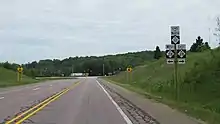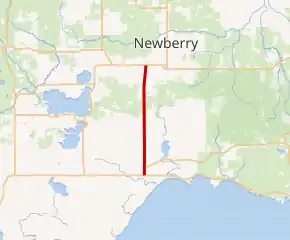 The highway begins at US 2, one mile (1.6 km) south of Engadine and crosses the Canadian National Railway line before entering town.[4][5] In Engadine, M-117 meets the western terminus of H-40 which runs on Hiawatha Trail. The trunkline passes a small pond in town and some farm fields north of Engadine. The terrain transitions to forest as the highway crosses into Luce County. The route angles slightly to the northeast to avoid Kaks Lake south of M-28 near Newberry.[4][6] M-117 provides an important connection between two of the main highways in the UP.[7] This connection is listed on the National Highway System,[8] a network of roadways important to the country's economy, defense, and mobility.[9] Of the ten state trunklines that connect M-28 and US 2, M-117 is one of three that do not overlap either. The others are US 45 and Interstate 75.[4][6]