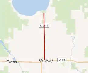 M-211 is a two-lane highway that starts at M-68 in downtown Onaway. The trunkline runs north out of town on Main Street past business and residences. It crosses the North Eastern State Trail and passes the Leo E. Getz County Airport north of town. M-211 enters an area of farmland north of the airport. As it continues north and approaches Onaway State Park, the terrain transitions to forest land. M-211 ends at the intersection with Bonz Beach Highway in front of the state park gate. All of M-211 is undivided highway.[4][5]