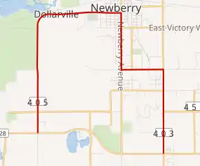 Once in the city of Newberry, Bus. M-28 followed West McMillan Avenue. At the intersection with M-117 (Newberry Avenue), Bus. M-28 turned south concurrently with M-117. The combined highway passed through the central business district. South of town, M-117/Bus. M-28 turned east along Campbell Avenue and then south along Miller Road. West of the Luce County Airport, M-117/Bus. M-28 met M-28; at this intersection, M-117 turned west along M-28 and the business loop ended.[4][5]