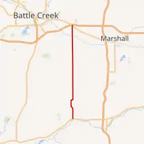 M-311 follows 11 Mile Road between M-60 and I-94. In the village of Burlington, M-311 is known as Marshall Street. There is a jog in 11 Mile Road as it runs northwesterly between Q Drive and O Drive. At N Drive, M-311/11 Mile Road turns along N Drive a short distance before turning back northward. Near D Drive, 11 Mile Road passes Hyde Lake. M-311 crosses the Kalamazoo River just south of I-94. All of M-311 is two-lane, rural highway in forest lands and farm fields,[3][4] and none of it is listed on the National Highway System.[5]