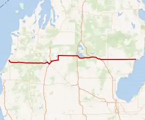 M-55 follows I-75 between exits 227 and 215, a distance of about 12 miles (19 km).[2] This section is the only part of M-55 that has been listed on the National Highway System,[4] a system of roads important to the nation's economy, defense, and mobility.[5] From the end of the freeway concurrency, M-55 follows Business Loop I-75 (BL I-75) into downtown West Branch. After leaving town, the highway runs through farm lands in rural Ogemaw and Iosco counties. The highway curves southeast into Tawas City. The eastern end of M-55 is at an intersection with US 23 along the shores of the Tawas Bay of Lake Huron.[2][3]