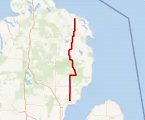 M-65 is a 103.176-mile-long (166.046 km) state trunkline highway in the US state of Michigan. The highway runs between termini on US Highway 23 (US 23) near Omer and Rogers City in the northeastern Lower Peninsula of the state. M-65 runs inland through several small communities in the region, passing through forests and fields along its course. M-65 crosses several watercourses, including the Au Sable River where it runs along the River Road National Scenic Byway. The region also includes the Huron National Forest and the Mackinaw State Forest areas.