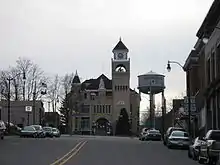 M-69 starts at the intersection of 5th Street and Superior Avenue in Crystal Falls, where it meets US 2/US 141. The Iron County Courthouse is located at the head of Superior Avenue and overlooks a steep hill headed east through downtown. The City of Crystal Falls states that the courthouse offers "a view of the main street of the City and the scenic panorama of the valley at its feet".[3] On a clear day, Iron Mountain can be seen from the courthouse tower.[3] It is from this starting point that M-69 descends Superior Avenue through downtown toward the Paint River in Iron County. The highway crosses the river on a historic bridge built in 1929 that features decorative lamp posts and railings.[4] The bridge was rehabilitated for five months in 2002. This rehabilitation involved replacing the bridge deck, repairing the bridge's substructure, and restoring the lighting and railings to original designs.[5] Because this bridge is listed on Michigan's list of historic bridges, the construction work had to preserve the original historic character of the bridge.[6] Final construction was completed at a cost of $1,130,545 (equivalent to $1.59 million in 2020[7]). A complete bridge replacement would have cost 25% more without saving the historic bridge.[5]