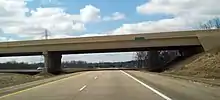 Construction of the remaining phases between US 131 and M-37 and between I-196 and US 131 was started on April 1, 2002. Area roads that crossed the path of the new freeway were closed to traffic with posted detours so that work could begin on the roadbed for the freeway.[38] The last major project for the freeway was to replace bridge beams in the overpasses from westbound I-196 to eastbound M-6.[40] Design flaws were found in 2002 in the size of the beams in the bridges over eastbound I-196 and the ramp from westbound M-6 to westbound I-196.[41] The replacement was originally supposed to close traffic along I-196 over a weekend in 2004, but kept a lane closed for a full week, backing up traffic on the Interstate for two miles (3.2 km); completion of the work was delayed when human error caused a shortage of nuts and bolts.[42]