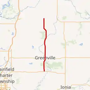 M-91 is a largely north–south state trunkline highway in the Lower Peninsula of the US state of Michigan. It runs from Belding to south of Lakeview. Its 24-mile (39 km) length exists entirely within Ionia and Montcalm counties. It is all undivided surface route. Aside from the two Michigan state highways that are its termini, it has only one other intersection with any Michigan state highway, and that is with M-57 in Greenville.