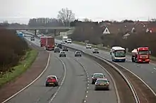 The line of the M1 in Belfast had been planned for a road since 1946 as the Southern Approach Road, though there were some disagreements on the route.[1] County planners in Armagh had also been working on plans to rebuild the then T3 trunk road which suffered from poor alignments, limited speed limits and was of failing construction, some work on which had been undertaken between 1955 and 1957.[1] These two plans were eventually upgraded into plans for the M1 by 1958. Construction began 1957 on the first bridge and subsequently the first section of the motorway.[1] In 1964, the Northern Ireland Government announced plans for an extensive route of motorways which saw the M1 now planned to go to Dungannon.[2] The M1 is the only motorway in Northern Ireland completed to its full planned length