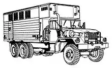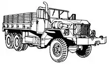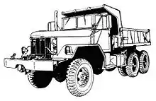 The M51 was a dump truck used to haul sand, gravel, dirt, rubble, scrap, and other bulk materials. It had a 10-foot-long (3.0 m), 5-cubic-yard (3.8 m3) dump body with cab protector and a tailgate that could hinge at either the top or bottom. They could be equipped with overhead bows, tarpaulin, and troop seats, but the relatively small size of the body limited their passenger or cargo load.[6][12]