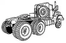 The M39 series had both single- and dual-rear-tire models; very few single-rear-tire trucks were built. Most models had 11.00×20s with dual rear tires; tractor wreckers had larger 12.00×20s. Bridge trucks and all M139 chassis-based trucks had 14.00×20s. [6] A standard military cab, designed by REO, was used. It had hinged doors with roll-up windows, a folding windshield, and a removable canvas roof. Cargo trucks and tractors could be fitted with a ring mount for a M2 Browning machine gun. A hard roof could be fitted.[2][3][9][10]