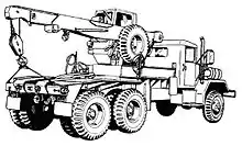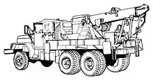 The M62 and 543 were wreckers used to recover disabled or stuck trucks and lift large components. A rotating, telescoping, and elevating hydraulic boom could lift a maximum of 20,000 lb (9,100 kg). The M62 had an Austin Western boom; its replacement, the M543, had one by Garwood. Although the truck was not meant to carry a load, the boom could support 7,000 lb (3,200 kg) when towing. They had 20,000 lb (9,100 kg) front and 45,000 lb (20,000 kg) rear winches, outriggers, boom braces, chocks, block and tackle, oxygen-acetylene torches, and other automotive tools.[6][17]