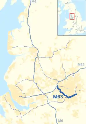 The earliest section of the M63 opened in 1960 as part of the M62 motorway.[1] In anticipation of the 1974 opening of the westward extension of the M62 to Liverpool, the existing section of motorway south of the Eccles Interchange was renumbered as the M63 in 1968.