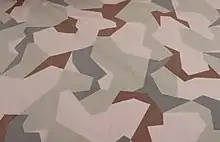 M90 camouflage is the camouflage pattern for the uniform system 90, used by the Swedish Armed Forces. The pattern consists of hard lined geometric shapes, aiming to create a camouflage pattern effective in the temperate forests and plains of Sweden. It is affectionately known among Swedish soldiers as lövhögen, or "the leaf pile."[1] In addition to the standard pattern, which was designed with Swedish forests in mind, desert and jungle variants were later developed for international missions.