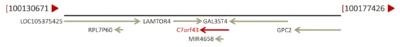 In humans, MAP11 is located in the long arm of human chromosome 7 (7q22.1), and is on the negative (antisense) strand.[1] Genes located around C7orf43 include GAL3ST4, LAMTOR4, GPC2.[1] In humans, C7orf43 has 9 detected common single-nucleotide polymorphisms (SNPs), all of which are located in non-coding regions and thus do not affect amino acid sequence.[3]