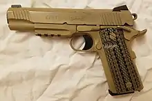 In 2014, the Marine Corps ordered 12,000 units.[18] The improved M45A1 CQBP features several changes to the original M1911A1 design. One feature is the dual recoil spring system that spreads out the recoil force of the .45 ACP round by lowering the peak force of the recoil pulse. It also has 3-dot tritium night sights, a 5-inch national match barrel, ambidextrous safety, picatinny rail, and a desert tan Cerakote finish.[19]