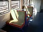 The seats originally used leatherette covering, and were coloured green in first class, and red in second class. During the first refurbishment programme, they were replaced by a fire and vandal-resistant design that used a navy blue plastic frame and purple fabric covering. In the second refurbishment programme, the seats were replaced again, with a similar design that used an orange plastic frame and a moquette of multicoloured stripes.[4][12]