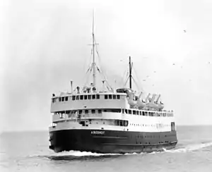 She measured 372 feet in length and displaced 7,000 tons. Her eight main engines generated 13,500 brake horsepower (10 MW) and drove propellers at both bow and stern. She could carry 950 passengers and 60 cars (or one complete passenger train of 16 railway cars).