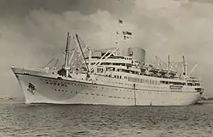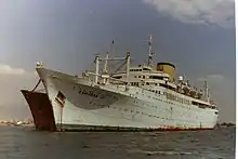 MV Aureol was a mid-sized British ocean liner, originally put into service for Elder Dempster Lines of Liverpool in 1951. She was constructed on the River Clyde in Glasgow by Alexander Stephen and Sons. At 537 feet long and measuring 14,083 gross register tons, Aureol had room for 329 passengers and carried 145 crew.[3] She spent her entire Elder Dempster career on the UK-Lagos passenger cargo service. From 1951 to 1972 she sailed from Liverpool, but closure of the landing stage and the hope of better loadings led to her being transferred to Southampton (first departure 26 April 1972) for the last two years of her service.