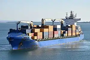 The mv Cristina A is a Turkish flagged container ship owned by the Turkey based Limar Liman ve Gemi Isletmeleri A.S. and operated by the Delmas Shipping Co. in Le Havre, France. The vessel has a capacity of 1,604 nominal teus or 1,174 teus 14TH. She has been in service since June 8, 2008 on the route between Europe and West Africa.[1] She is the 18th vessel in the fleet of Arkas Shipping & Transport Co. with the company having 23 container ships in total as of October 2008.[3] The shipping line is ultimately operated by CMA CGM through its subsidiary OTAL.