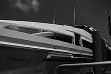 A close up quartering view of Grey Lady at dock