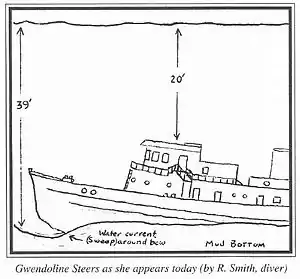 The wreck of the Gwendoline Steers lies in 38 feet of water at the mouth of Huntington Bay, NY between Eaton's Neck and Lloyd Neck on the north shore of Long Island. The distance is 20 feet from the top of the pilot house to the surface of the water at mean low water. A significant amount of hardware has been stripped from the vessel by recreational divers, but the structure of the vessel remains in excellent condition, however visibility at the wreck is lower than surrounding Long Island Sound wrecks. The wreck appears in a number of books detailing Long Island dive sites.