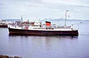 Derrick-loading was slow and traffic was lost to the 1964 hoist-loading MV Hebrides at Uig, Skye.[1] In January 1972, Loch Seaforth was withdrawn from the Stornoway route and transferred to Oban as the Inner Isles mailboat, serving Coll, Tiree, Castlebay and Lochboisdale in place of the younger MV Claymore. Soon after this, Ullapool became the mainland port for Stornoway, initially served by MV Iona and then the converted MV Clansman.