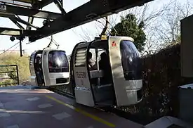 The pulse-movement gondola system runs two sets of two unidirectional six-seater tandem cabins. In each direction, there are two ropes, one for carriyng and the other for hauling the cabins. The cabins stop at the terminal, and they are accelerated to line speed at 4 m/s (13 ft/s) after leaving the terminal. In case of power supply cut, a standby generator ensures the travel of the cabins to the target station at a low speed.[1][2]
