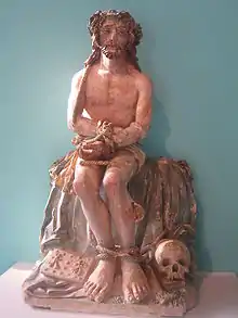 Depictions of Christ at the time of the crucifixion were much favoured by the sculptors or imagiers of the 16th century and particularly in the Champagne-Ardennes region. Some were entitled "Christ aux liens", others " Christ de pitié". These depict Christ sitting on a rock, this rock often covered by his discarded robe. Often, and to underline the association with the sequence of the "Passion", a skull is put at Christ's feet, reminding us of Golgotha. In these studies Christ is in all probability sitting at Golgotha awaiting his crucifixion and watching the executioners prepare the cross. All these works exude pathos and an overwhelming feeling of despair and hopelessness. The flagellation and the effort of carrying the Cross to Golgatha is over and the agony of the crucifixion itself is to come.