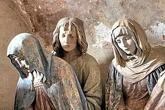 This sculpture in the parish church of Saint-Jean-Baptiste in Chaource in the Aube is the work of the sculptor who became known as the "Maître de Chaource". The composition shows Jesus being laid into His tomb. The group includes Joseph of Arimathea and Nicodemus holding Jesus' body before it is placed in the tomb. Also featured are Mary of Clopas,[5] the Virgin Mary, Mary Magdalene, St John, Mary Salome and some soldiers/guards. The work is thought to have been completed in 1515.