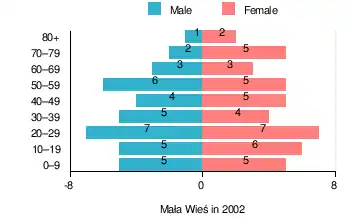 According to the 2002 Poland census, there were 80 people residing in Mała Wieś village, of whom 47.5% were male and 52.5% were female. In the village, the population was spread out, with 23.8% under the age of 18, 36.3% from 18 to 44, 22.5% from 45 to 64, and 17.5% who were 65 years of age or older.[1]