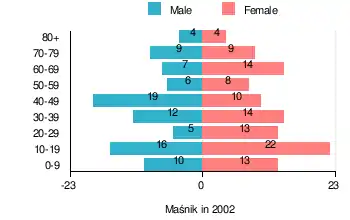 Figure 1. Population pyramid of village in 2002 — by age group and sex[1]