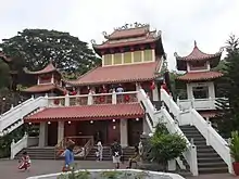 With an elevation of 70 above sea level, the 7-story temple is a towering 11-tiered, multi-hued attraction on a more than a hectare of lot and accessible by separate routes. The temple's attractions include the Majestic Five Door Gate, Bamboo Garden, the Liang Thing Pagoda, 2 circular pools or ponds and the golden emblem of a dragon, the Bell Tower and the Drum Tower.[3] The interiors of Ma-Cho Temple is filled with Chinese ancient decorations or art. Taiwan laborers helped build the building under famous Architect Thomas Diokno.[4] The temple is adorned by Chinese motif of Taipei lions and dragons (camphor woods) and massive stones. Its original spider type dome awes the beholder with the interlinking wood carvings of saints (piling up in a total of 11 tiers). Statues of animals, the famous towering arch, and the meditation room all focus on Mazu's eyes, which are closed while her hands are clasped together at her chest.