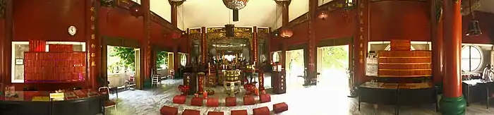 The temple is not exclusively dedicated only to Mazu, Tu Di Gong or Tho Ti Kong, an Earth Deity, is also venerated in the temple. An statue of Kuan Yin Ma or Guanyin, a Buddhist Goddess of Mercy, stands in the garden.[6] In the exterior of the temple, the “Chinese 18 Saints" (carved in stone statues) are worshipped at the entrance wall, facing the temple patio made of "tisa" or bricks in circular form. The courtyard has a pond of water lilies and gold fish.