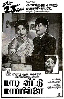 Maadi Veetu Mappillai (transl. The Son-in-Law who stays on the top floor) is a 1967 Indian Tamil-language comedy film, directed by S. K. A. Chari.[3][4] It stars Ravichandran and Jayalalithaa. The supporting cast includes Major Sundarrajan, Nagesh, V. K. Ramasamy and K. Balaji. The music was provided by T. Chalapathi Rao. The film was a remake of the Telugu film Illarikam (1959).[5]