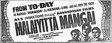 Maalaiyitta Mangai (transl. The woman who garlanded) is a 1958 Indian Tamil-language film directed by G. R. Nathan and produced by Kannadasan under his own production company Kannadhasan Films.[1] The film's soundtrack was composed by Viswanathan–Ramamoorthy. The film stars T. R. Mahalingam, Pandari Bai and Mynavathi, with Manorama (in her acting debut), Kaka Radhakrishnan and C. Lakshmi Rajyam in supporting roles. It is based on Sarat Chandra Chattopadhyay's novel Chandra Nath.[2] The film was released on 27 June 1958 and became a success.[3][4]
