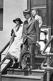 After the premier's testimony was completed, Smith called his wife, Florence Brownlee.[30] She supported her husband's account of MacMillan's relationship with the Brownlee family and reported that, when the premier drove MacMillan home at night, he was very seldom late returning.[44] On cross-examination, she denied that she would have defended her husband if she believed him to be guilty.[45] Additional witnesses for the defence included Brownlee's personal secretary, Civil Service Commissioner Frederick Smailes, and four legislature janitors. Smailes acknowledged knowing at the time of MacMillan's hiring that she was acquainted with Brownlee, but denied involvement on Brownlee's part in the decision to hire her, while the janitors denied ever seeing a young woman enter the premier's office in the evenings.[46] Jessie Ellergert, who had worked for the Brownlees as a maid, said that she had no reason to believe that there was a sexual relationship between the premier and MacMillan; moreover, she specifically recalled the Halloween night MacMillan had referred to in her testimony, and testified that the household was far too bustling for the alleged sex to have occurred.[47]
