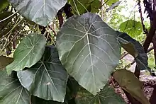 Macaranga grandifolia is a species of flowering plant in the family Euphorbiaceae.[2] Common names for this plant include nasturtium tree, parasol leaf tree and bingabing. It is endemic to the Philippines and has been widely cultivated in Hawaii as a tropical ornamental. This plant has become very popular garden ornamental in many parts of the tropics for the extraordinary grandiose leaves, which are rounded-ovate in shape, with prominent, reddish veins and the stem attached towards the center of the leaf blade. The flowers are pinkish red and the males are held in coral-like, congested inflorescences. Twine made from the bark and the wood was used for fishing spears. The leaves were used to wrap food. Birds eat the ripe fruit.[3]