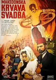 Macedonian Blood Wedding (Macedonian: Македонска крвава свадба, romanized: Makedonska krvava svadba), also known as Bloodshed at the Wedding, is a 1967 Yugoslav historical drama directed by Macedonian director Trajče Popov. The screenplay was written by Slavko Janevski and is based on the 1900 play of the same name by playwright Vojdan Chernodrinski. The film was released through the production company Vardar Film. It tells the story of a young Macedonian woman Cveta who is kidnapped by a Turkish bey in North Macedonia under the rule of the Ottoman Empire. It follows her resistance to converting to Islam and renouncing her national identity along with the uprising of the locals against the Ottomans.