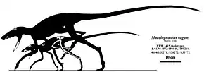 The type species, Macelognathus vagans, was described by Othniel Charles Marsh in 1884 as a turtle based on a partial jaw from the Late Jurassic Morrison Formation at Como Bluff, Wyoming.[3] After being referred to the Dinosauria by Moodie in 1908,[1] it was later reclassified by Ostrom in 1971 as a crocodilian relative.[4] Based on new material from the Morrison Formation at Fruita, Colorado, in 2005 Göhlich et al. identified it as a basal crocodylomorph ("sphenosuchian").[5] It is considered an example of convergent evolution, due to the similarities to caenagnathid dinosaurs, with which it was not closely related. It was between 3.9 and 6.2 feet (1.2 and 1.9 m) long.