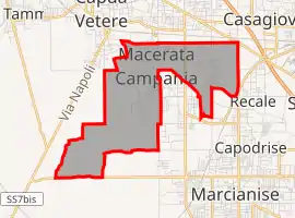 Its history is linked, for its origins, with the ancient city of Capua, corresponding to the current Santa Maria Capua Vetere, because it had been part of the latter for many centuries, until the year 841 (the year of the invasion of the Saracens, who destroyed ancient Capua). The population was dominated by Lombards, Normans, Swabians, Angevins and Aragonese. According to Francesco Granata[8] the ancient city of Capua extended in a territory of about six miles and, in the XVIII century, it was occupied by the hamlets of S. Maria Maggiore, S. Pietro in Corpo, Curti, Macerata and S. Andrea de' Lagni. Furthermore, near the chapel of the Blessed Virgin of Graces of Macerata Campania there was the ancient Porta Atellana of Capua from which the Via Atellana started, leading to the farmhouse of Macerata that linked ancient Capua with Atella [9][10].
