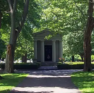To the south of the main drive is the smaller Lampson mausoleum. It is built of panels of New Hampshire granite locked together by their own weight. Scottish variegated granite columns are on the north (front) elevation. Between them are marble doors opening into a chamber with a marble mosaic floor.[2]