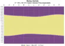 Mackay has a humid subtropical climate (Cwa) under the Köppen climate classification.[59] Average maximum temperatures range from 30 °C (86 °F) in summer to 23 °C (73 °F) in winter, while minimums range from 11 to 23 °C (52 to 73 °F).