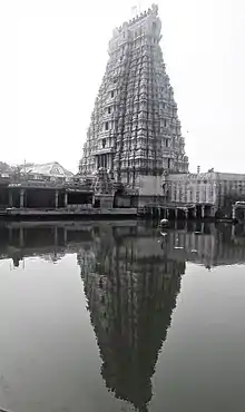 The temple has a five-tiered gopuram (temple tower) and large precincts. The central shrine is that of Vaidyanathar present as lingam in the inner most sanctum. The first precinct around the sanctum has the metal images of Somaskanda and stone sculptures of Nataraja, Durga, Dakshinamoorthy, Surya (Sun god). The shrine of Sivakami is located in a parallel shrine to the right of the sanctum. There are two gates to the temple, each leading to the Shiva and Sivakami shrines. The Sthala Vriksha (temple tree) is margosa (Azadirachta indica) which possesses medicinal properties. The temple has two water tanks, one located opposite to the temple and one right to the main gate. The Siddhamirdham tank located opposite to the temple is believed to be having curating effects where worshipers take a holy dip. The temple has a Kalayana Mahal (marriage hall) in front of the Sivakami shrine and the sculpture of Nayak king can be found there. There are paintings from the Nayak period in ceiling of the hall leading to the sanctum.[3] In modern times, the temple is maintained and administered by the Hindu Religious and Endowment Board of the Government of Tamil Nadu.[4]
