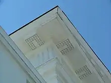 Above the central block and in line with the two wings rises a tall octagonal cupola, with four clock faces located respectively on each of the cardinal sides, just above its base. It is marked at each of its eight corners by an engaged Ionic column. Large sash windows punctuate the south façades and, originally also the east and west ends of the two smaller wings. Today the exterior constitutes the only part of the structure that retains the Greek Revival details. The portico sports a thin two-banded architrave and above that a prominent yet severe frieze of triglyphs separated by bare metopes; an additional bay is allotted for the central intercolumniation. Heavy modillions with guttae adorn the raking cornice and pediment that crown this part of the structure.