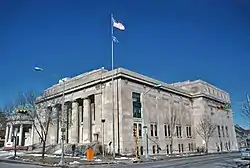 It is a three-story building with four colossal columns in its front facade, with its three main entrances set back from them. It is 112 by 182 feet (34 m × 55 m) in plan and has a large, 1200-plus seat auditorium in its rear section.[2]