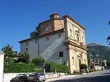 The church construction began in 1662 to house an image of the Madonna del Prato, that was held to be miraculous. The plain facade with two statues does not prepare the visitor for the interior, which is a near replica of the interior space and ordering of San Carlino alle Quattro Fontane, one of the masterpieces of Baroque architecture in Rome, by Francesco Borromini. The architectural plan is attributed to Carlo Perugini, but there is evidence Borromini may have played a direct role.[1] The dome, which in Rome is populated by geometric crosses, was frescoed by Francesco Allegrini and Louis Dorigny (1677–78). The church also has altarpieces by Ciro Ferri, Gaetano Lapis, and Domenico Maria Viani.[2]