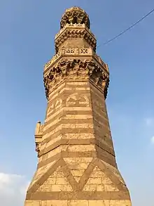 The building's facade faces the street to the northwest, and the domed mausoleum jets out from the south end of the facade and into the street through a rectangular, cross-vaulted space. This madrasa shows the tendency of Mamluk architecture to prefer that the front of the building faces the existing street, while at the same time orienting the interior of the mosque toward the qibla. In this case, the facade is composed of the madrasa and mausoleum, and the mosque is located behind the facade, furthest from the street. This choice to make the secular aspects of the building visible to the public, reflects the Mamluks' tendency to value prestige over piety. The mausoleum was also presented in this fashion in order to attract the attention of pedestrians in hopes of receiving their blessings.[8] From the outside of the Madrasa of Sarghatmish one can see its octagonal minaret on the eastern corner of the facade. It was elegantly constructed and has patterns of two-colored inlaid masonry. The facade itself is 15.5m high and contains the main portal to the building's interior. The portal is emphasized by an elevated section of the facade called a pishtaq.[9] Additionally, pendative triangles are seen under the portal's semi-dome.[10] The upper walls of the facade are aligned with small rectangular windows which belong to the living quarters. The windows also appear on the rear facade as part of the students' cells. Outside the building the dome over the mausoleum is clearly visible. The double-shelled, exotic dome is made out of bricks that form an unusually high drum.