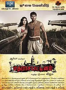 Madrasapattinam (English: Madras Town) is a 2010 Indian Tamil historical romantic drama film written and directed by A. L. Vijay. The film stars Arya and Amy Jackson, in her feature film debut,[1] while Nassar, Cochin Hanifa, Lisa Lazarus, and Alexx O'Nell play other prominent roles.[2] The music was composed by G. V. Prakash Kumar with editing by Anthony and cinematography by Nirav Shah. The film was released on 9 July 2010. The film became a box office success.[3]