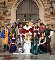 A Madrigal Dinner or Madrigal Feast is a form of Renaissance dinner theater often held by schools and church groups during the Christmas season.[1] It is set in the Renaissance Era and is generally comedic in nature. The meal is divided into courses, each of which is heralded with a traditional song. A play is performed between the courses, and a concert of choral music concludes the festivities.