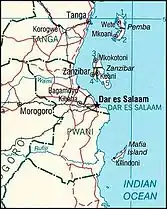 Mafia Island, (394 km2 (152 sq mi)), lies off the east coast of Tanzania opposite the delta of the Rufiji River.[1] The 20 kilometres (12 mi) wide stretch of water between the delta and the island is called the Mafia Channel. Mafia Island is part of a small archipelago with several much smaller islands, some of which are inhabited. The main town on Mafia is Kilindoni on the west coast. On the east coast is Chole Bay, Mafia's protected deep-water anchorage and original harbour. The bay is studded with islets, sandbanks and beaches, and is protected from the east by reefs and Juani Island.